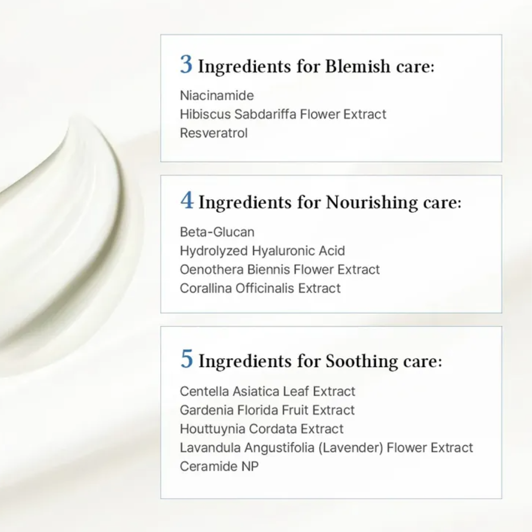 Water, Propanediol, Glycerin, Cyclohexasiloxane, 1,2-Hexanediol, Caprylic/Capric Triglyceride, Niacinamide, Panthenol, Polyglycerin-3, Polyglyceryl-10 Stearate, Hydrogenated Poly(C6-14 Olefin), Hydrogenated Polydecene, Laminaria Japonica Extract, Eclipta Prostrata Leaf Extract, Melia Azadirachta Flower Extract, Houttuynia Cordata Extract, Melia Azadirachta Leaf Extract, Oenothera Biennis (Evening Primrose) Flower Extract, Curcuma Longa (Turmeric) Root Extract, Ocimum Sanctum Leaf Extract, Calendula Officinalis Flower Extract, Agave Tequilana Leaf Extract, Sargassum Fulvellum Extract, Corallina Officinalis Extract, Lavandula Angustifolia (Lavender) Flower Extract, Centella Asiatica Leaf Extract, Opuntia Ficus-Indica Stem Extract, Gardenia Florida Fruit Extract, Perilla Ocymoides Leaf Extract, Hibiscus Sabdariffa Flower Extract, Sodium Hyaluronate, Hydrogenated Lecithin, Empetrum Nigrum Fruit Juice, Dicaprylyl Carbonate, C14-22 Alcohols, Ammonium Acryloyldimethyltaurate/Vp Copolymer, Polymethylsilsesquioxane, Dipropylene Glycol, Butylene Glycol, C12-20 Alkyl Glucoside, Acrylates/C10-30 Alkyl Acrylate Crosspolymer, Ethylhexylglycerin, Polyquaternium-51, Tromethamine, Fructooligosaccharides, Adenosine, Beta-Glucan, Glycine Soja (Soybean) Sterols, PEG-40 Castor Oil, Hydrolyzed Hyaluronic Acid, Resveratrol, Tocopherol, Ceramide Np, Oligopeptide-1, Phenoxyethanol, Potassium Sorbate