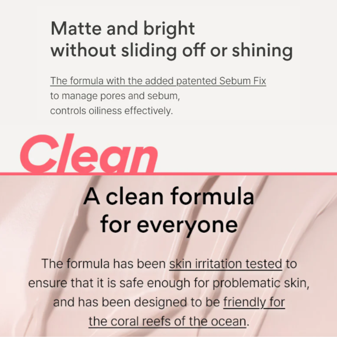 - Helps reduce sebum secretion and prevents the skin being greasy during wearing with the Sebum Fix Formula.