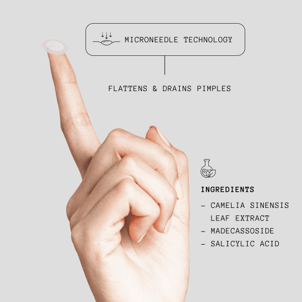 - Microneedle Technology that reduces, flattens, and drains big, angry pimples with pus OVERNIGHT.