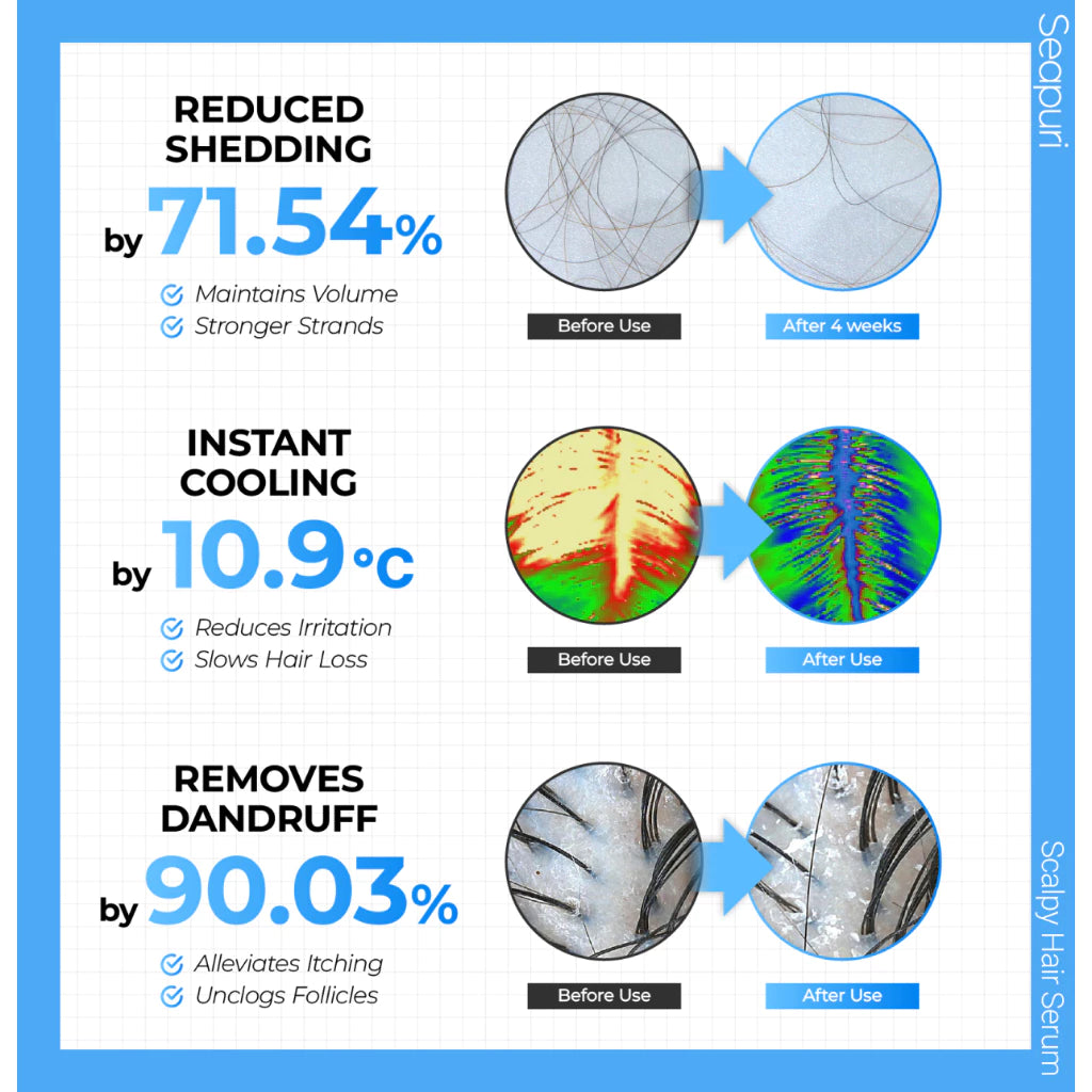Certified by the Ministry of Food and Drug Safety as anti-hair loss functional product. - 100% satisfaction proved from clinical trial results including improvement of weak hair, hair volume, scalp dead skin cells, and scalp cooling.